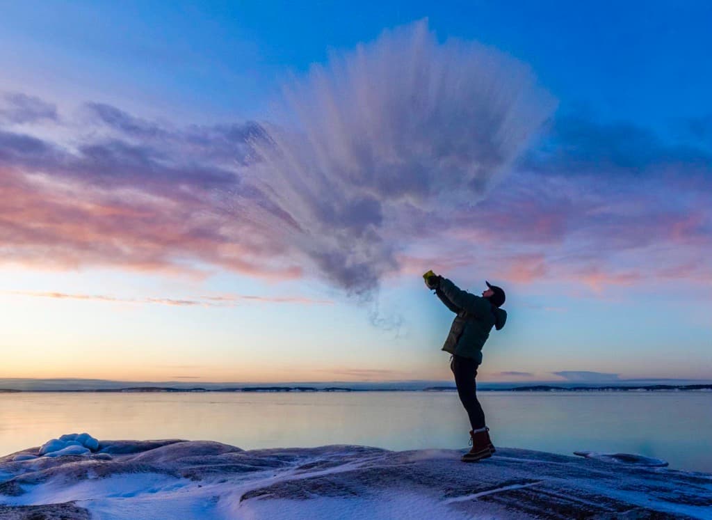 Är det riktigt kallt ute kan du skapa ett eget, magiskt snöfyrverkeri med bara vatten! Koka upp vatten och ta med ut i en termos. Kasta det sedan högt upp i luften och njut av det vackra snömolnet som skapas! Det beror på att varmt vatten vid vissa tillfällen fryser snabbare än kallt vatten. Var försiktig så att du inte får kokande vatten på dig!