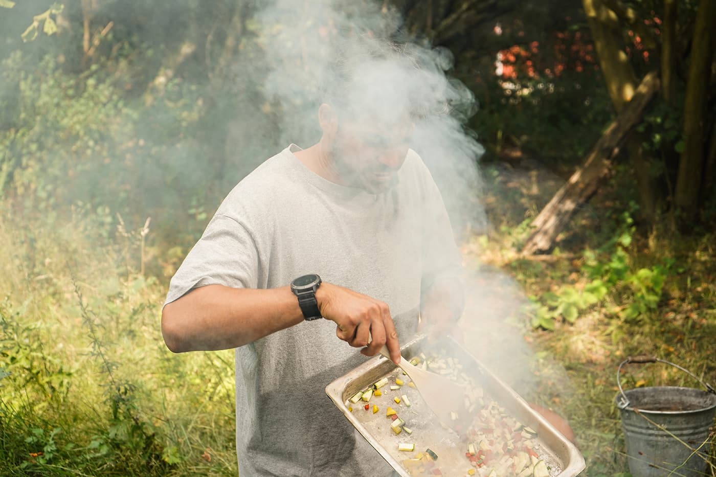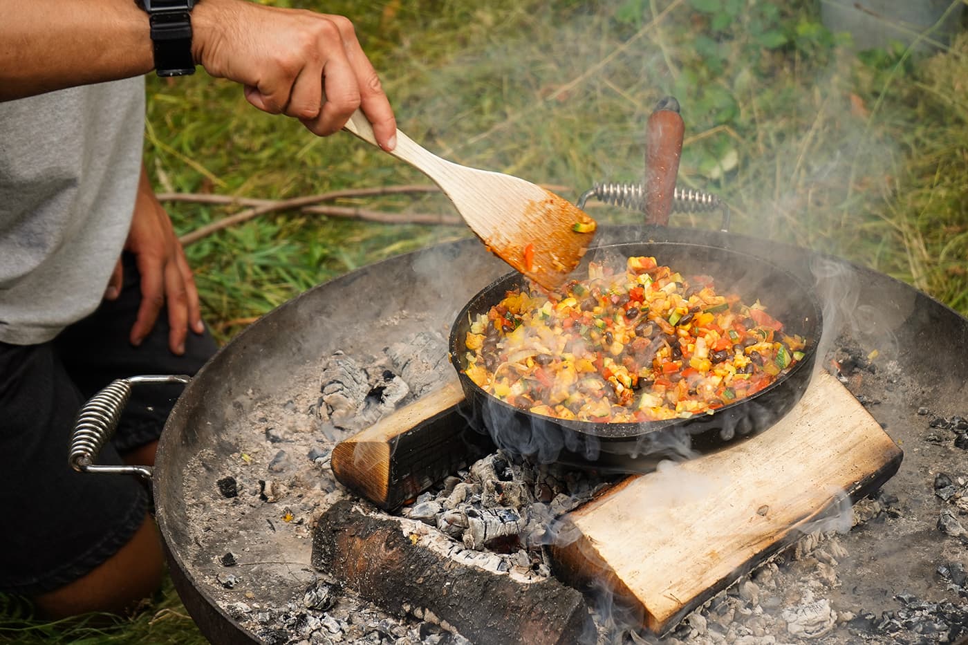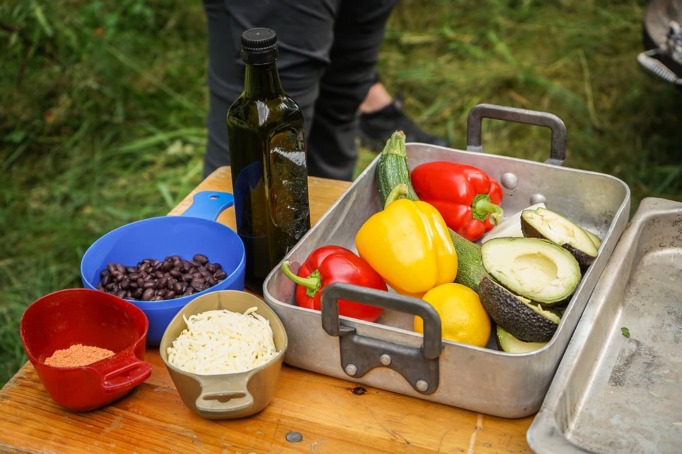 - Stek grönsakerna: Placera en gjutjärnspanna över den öppna elden. Tillsätt olivolja och låt den värmas upp. Stek löken tills den börjar bli genomskinlig. Tillsätt sedan paprika, zucchini, majs, och svarta bönor. Krydda med spiskummin, paprikapulver, salt och peppar. Stek tills grönsakerna är mjuka och har fått lite färg.