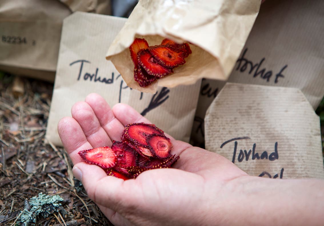 – Smaka här, säger hon, och låter alla få sin del av torkade jordgubbsskivor och äppelskivor.