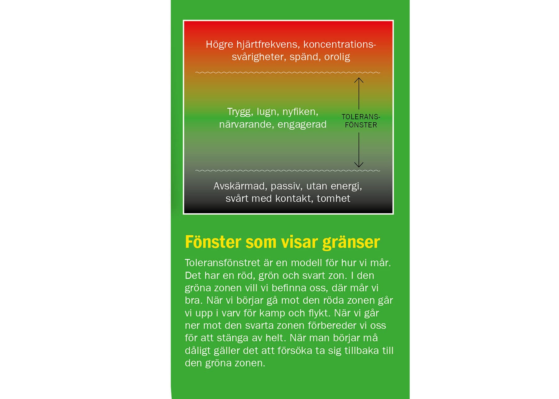 Under kvällen får scouterna också höra talas om Toleransfönstret. Det är ett låtsasfönster som man kan använda för att ta reda på hur man mår. Om man är i sitt toleransfönster mår man bra. Om man är utanför mår man inte bra. Ovanför rutan är man arg och flaxig. Under den är man så ledsen att man bara vill dra sig undan. Det gäller att vara uppmärksam på tecken som visar att man är utanför sitt fönster. Och så behöver man knep för att kunna lugna ner sig och ta sig tillbaka in i fönstret igen. Det kan vara att ringa en vän, ta sig till en trygg plats, eller att äta eller dricka något.