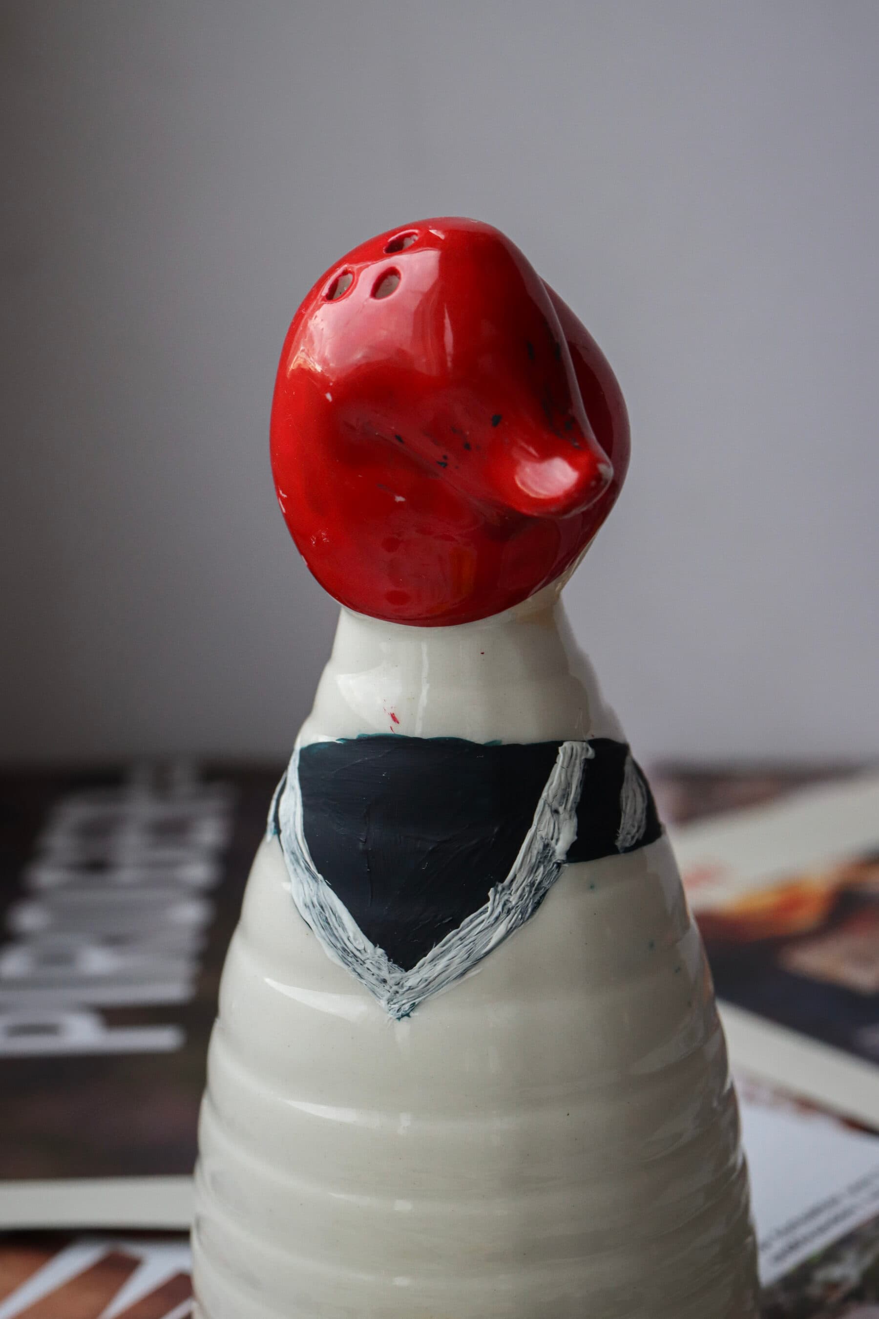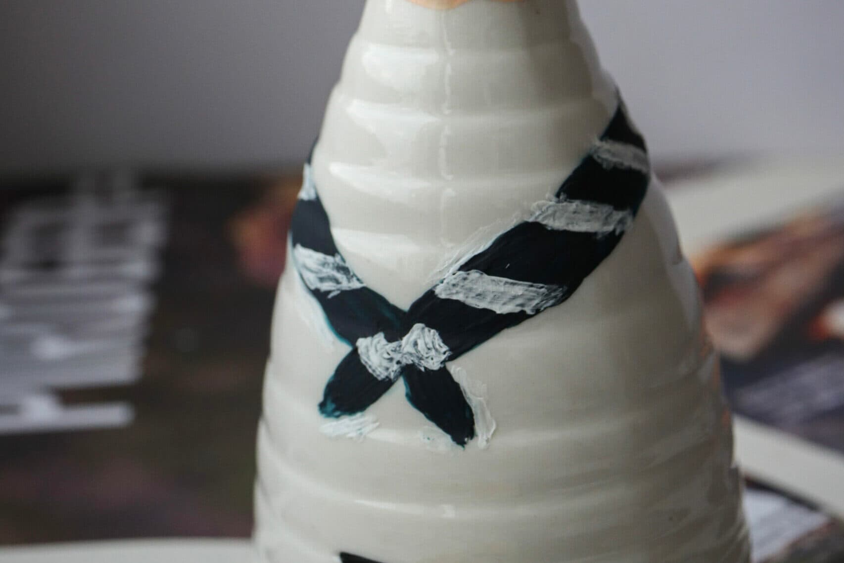 - På framsidan målar du kanten som polkagrisränder. På ryggen målar du ett streck längs med den undre kanten av triangeln.