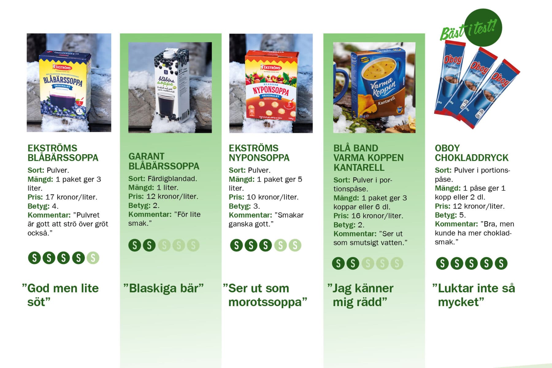 När blåbärssoppan kommer fram tänds förväntan i ögonen. Det här är en klassiker som alla i gänget gillar. I det här testet finns soppan med både som pulver och färdigblandad i termos. Och det är ingen tvekan. Pulvervarianten är bäst, även om det kräver värmning av vatten och vispning.