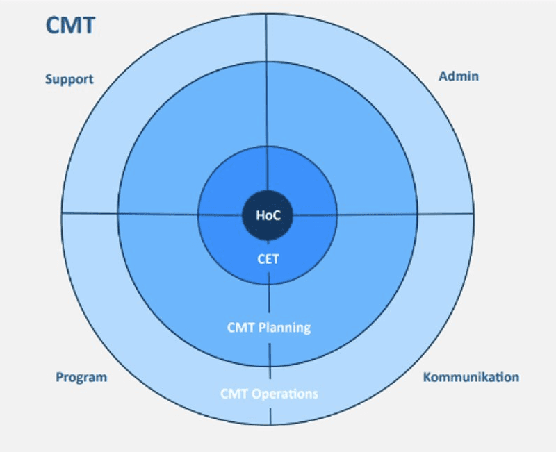 Det är fyra funktionsområden och varje område leds utav två funktionsansvarige varav en också är med i CET. De fyra områden har medlemmar som är med i Contingent Management Team Planning (CMT Planning) och Contingent Management Team Operation (CMT Operation).